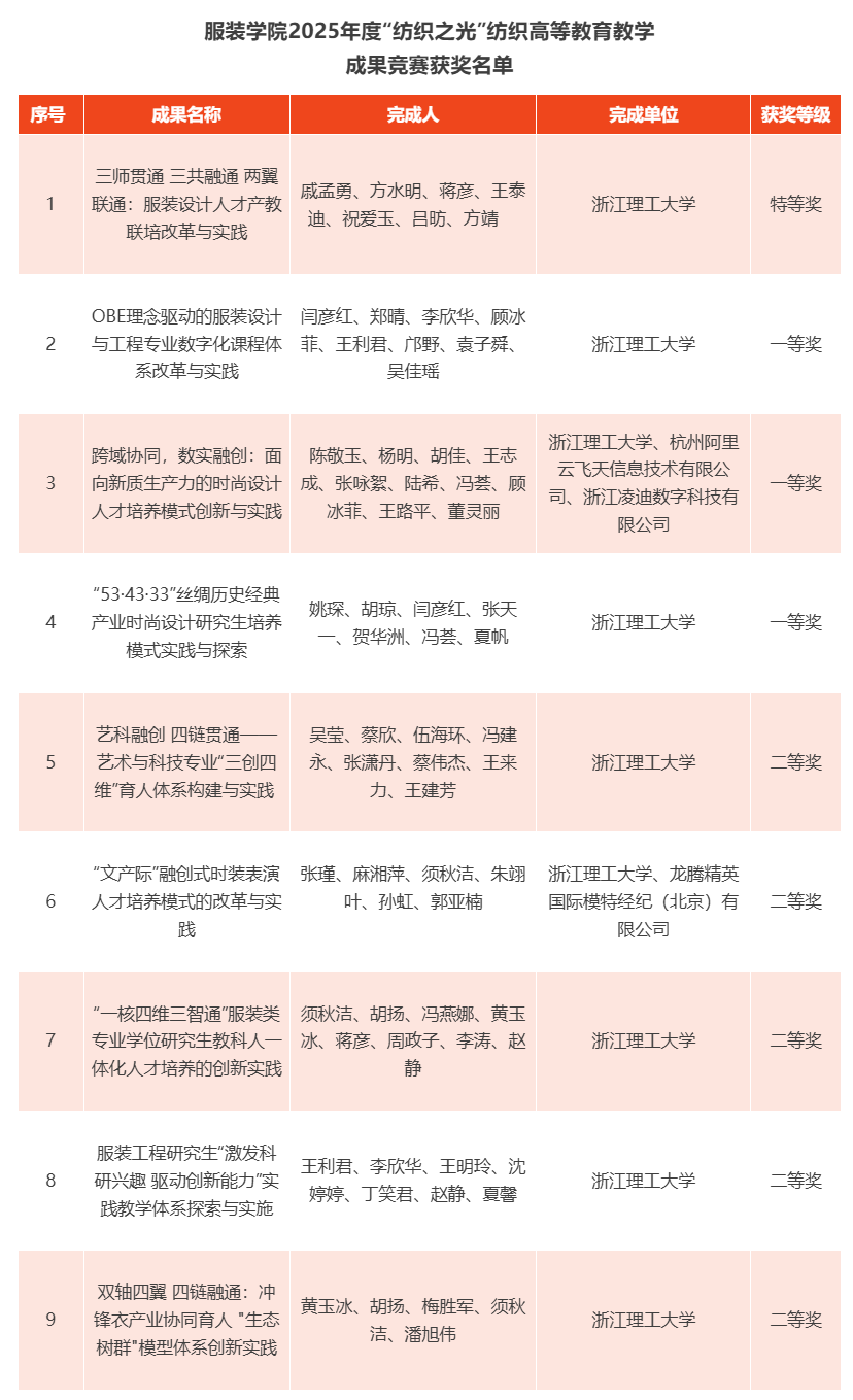 此外,在近期公布的2025年度“纺织之光”纺织高等教育教学成果竞赛中,服装学院斩获特等奖1项、一等奖3项,二等奖5项。