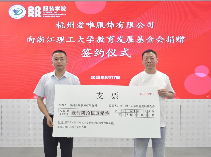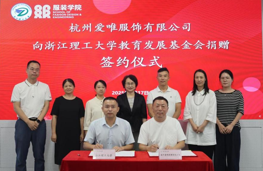 杭州爱唯服饰有限公司向我校捐赠175万元,设立“爱唯教育基金”,用于支持纺织、设计学科建设和人才培养;并投入105万元与我校共同成立时尚产业研发中心,助力学校教育事业与时尚产业同频发展。