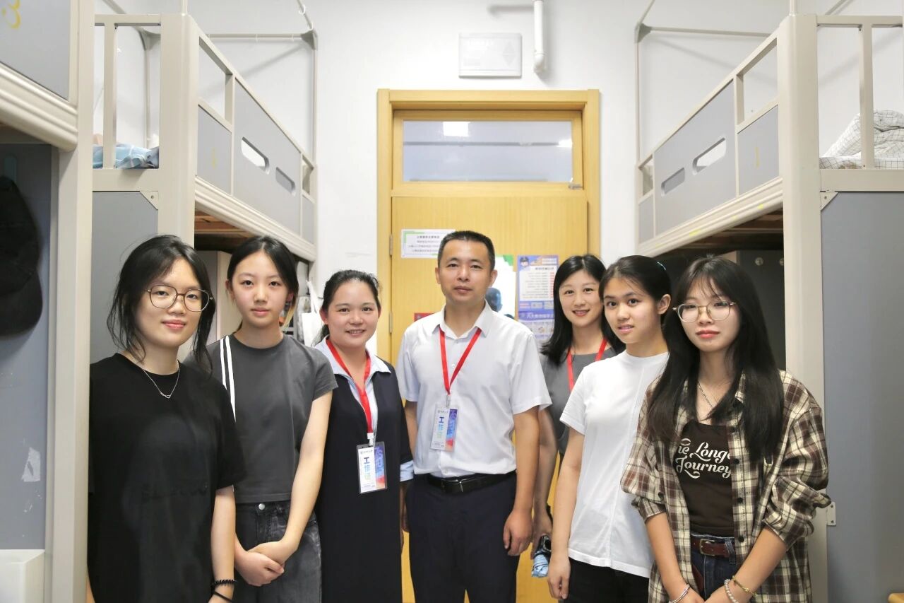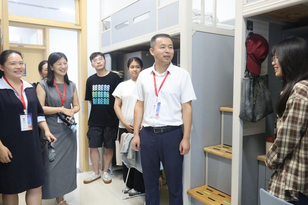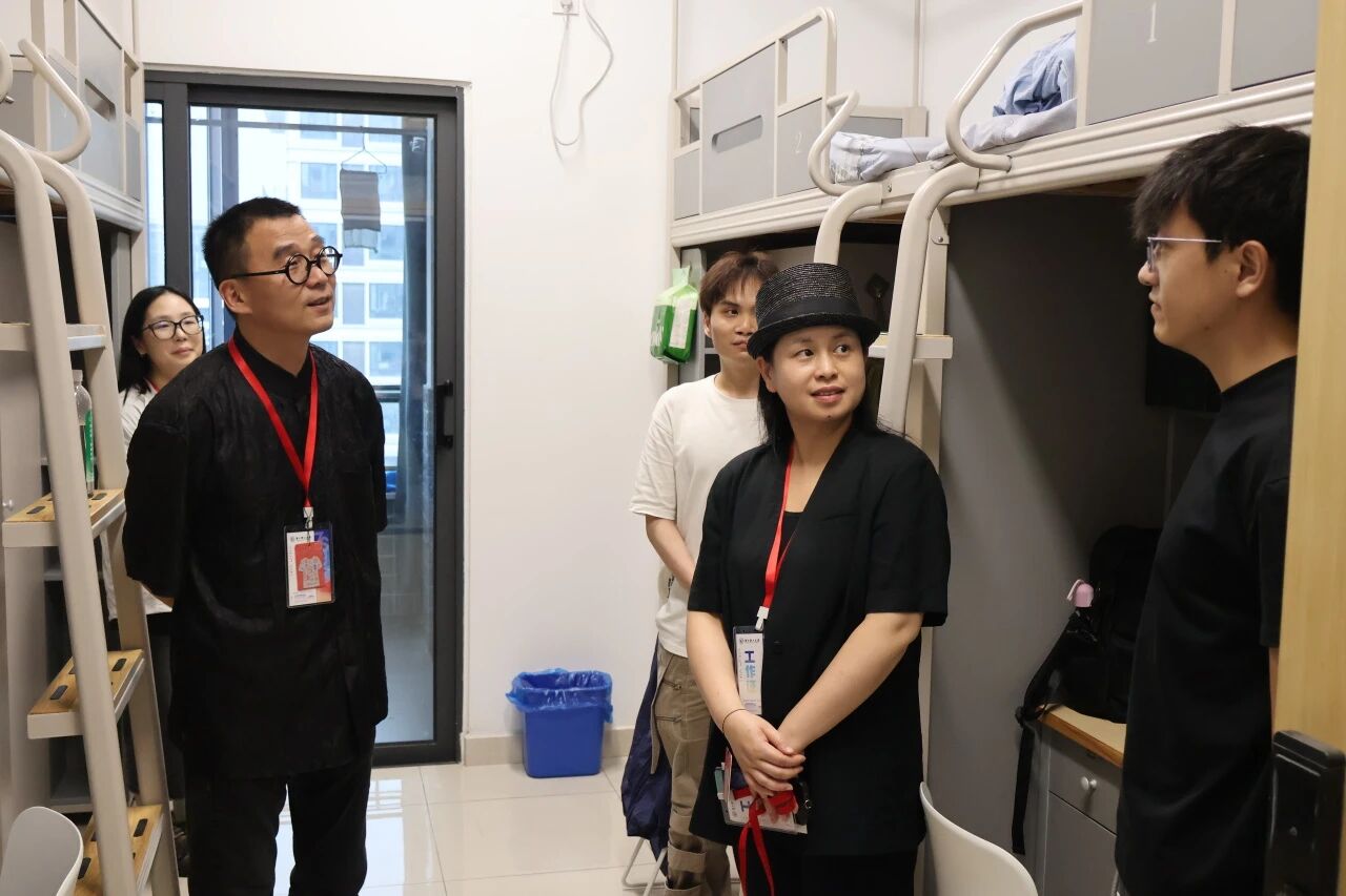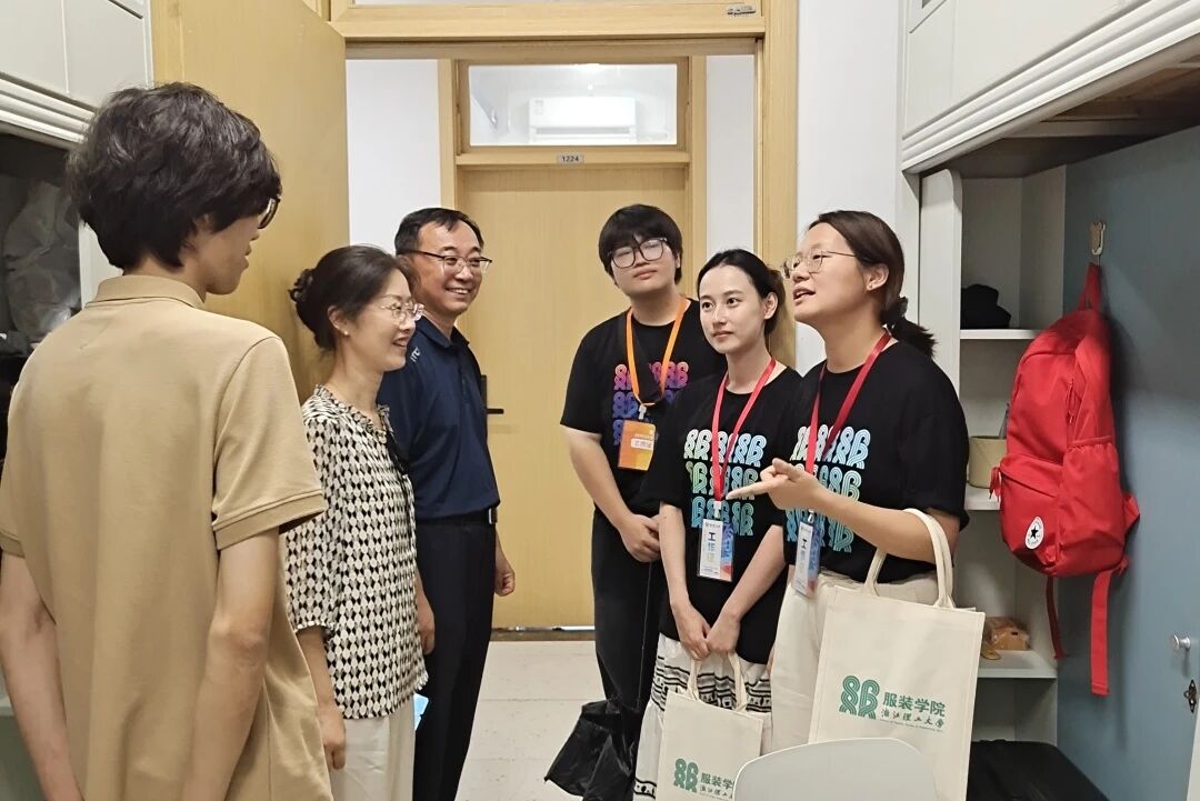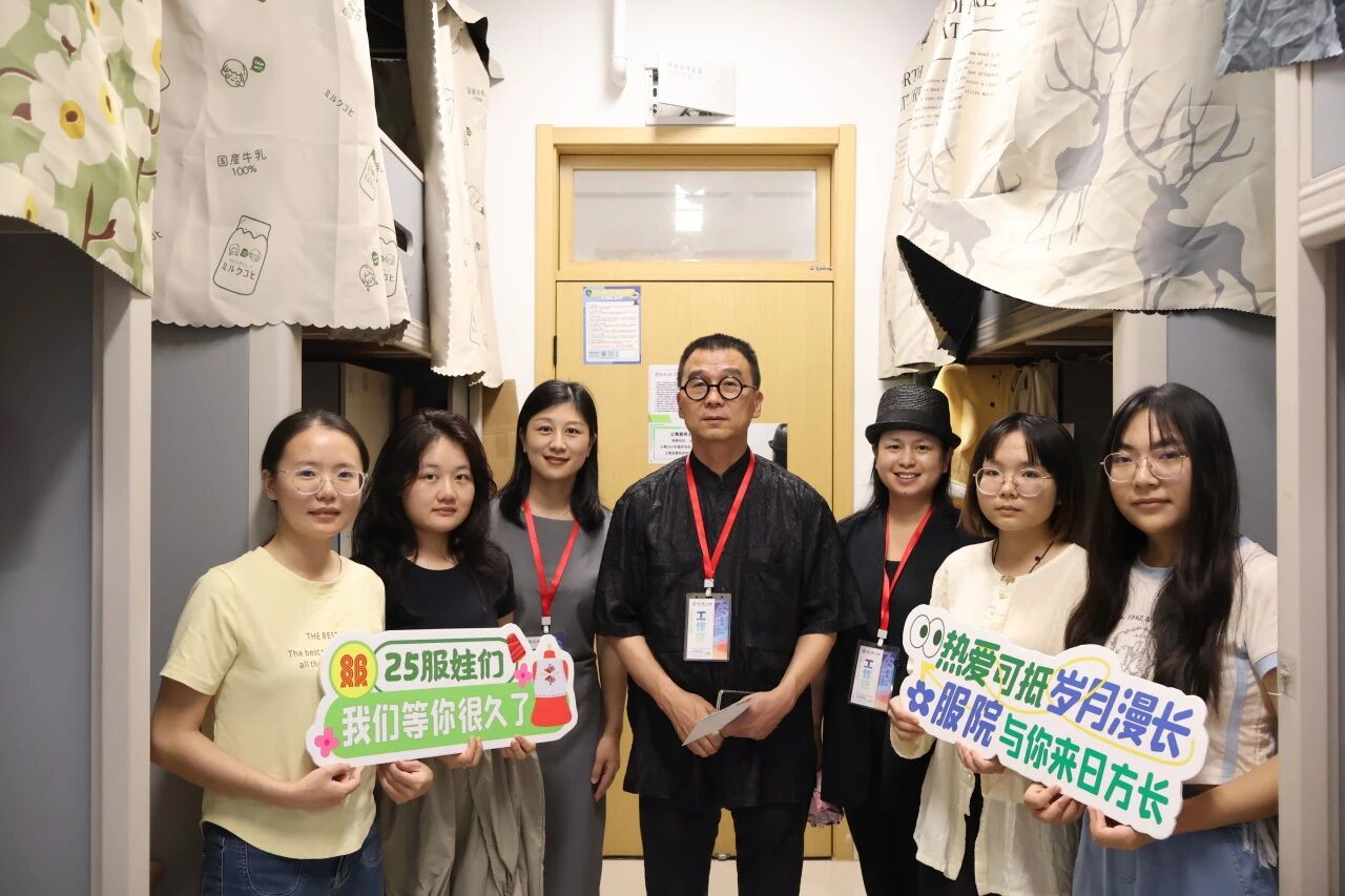 当天下午,服装学院党委书记吴跃峰、院长崔荣荣带队,副院长须秋洁、顾冰菲,党委副书记吴霁乐,以及全体新生班主任、辅导员深入学院新生宿舍,带来“家门口”的贴心关怀。老师们鼓励大家要尽快融入服装学院这个温馨、创新的集体,多与学长学姐、专业老师交流,打好基础、勇于实践,在未来的学习生涯中尽情释放对时尚与艺术的热爱。