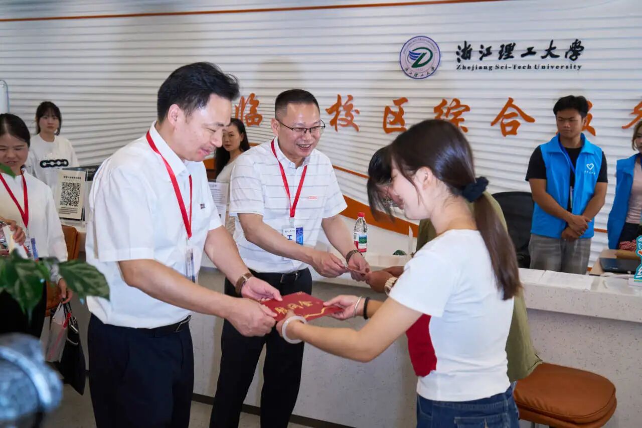 校领导们为同学们送上浙理文创产品,鼓励新生们要珍惜大学时光,始终保持求知的热忱与青春的活力;扎实学好专业知识,不断提升创新与实践能力,未来为行业进步与国家建设贡献浙理人的智慧和力量。