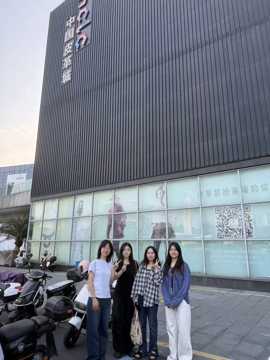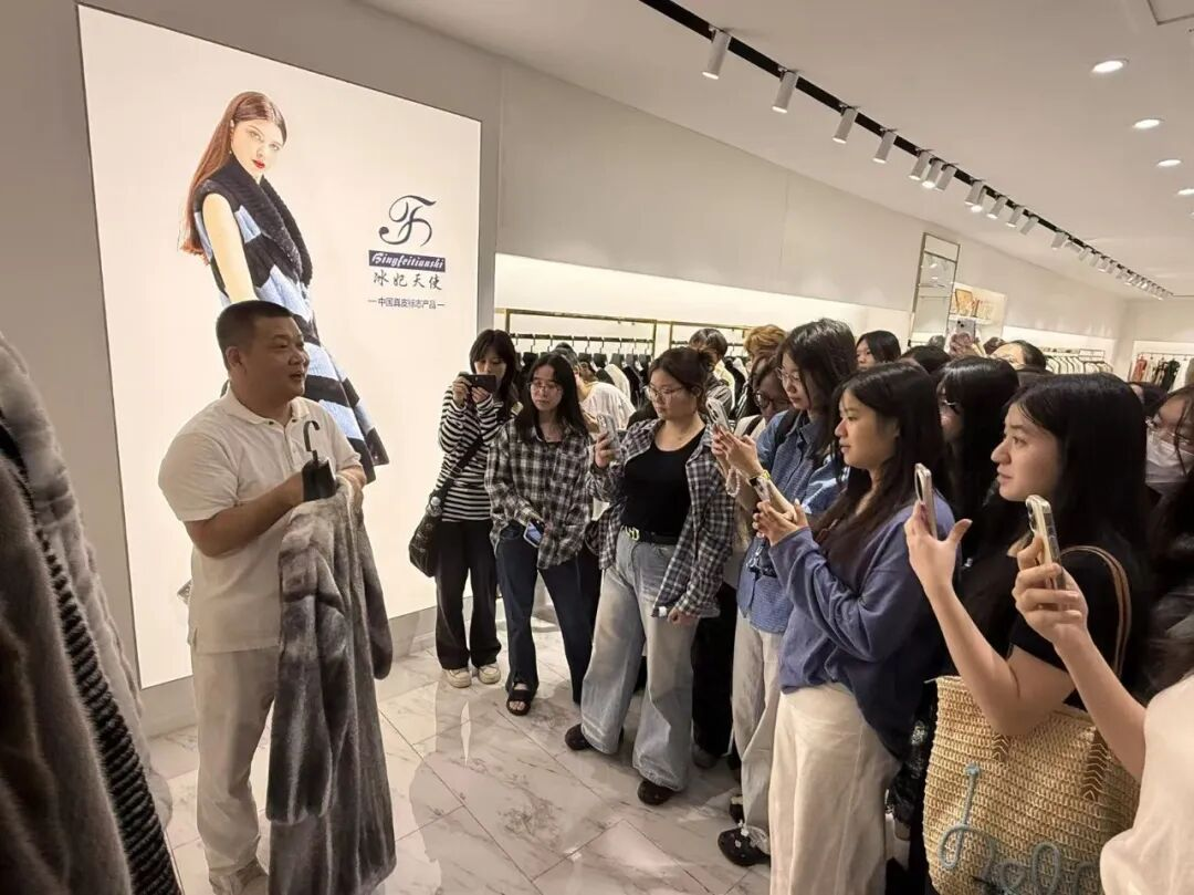 在企业访学之后,课程团队带领学生前往海宁中国皮革城开展市场调研,重点了解皮草产品在当季市场中的流行趋势、消费结构及品牌定位。通过对不同品牌专柜、渠道类型和价格体系的观察与记录,学生们系统分析了皮草类服装在材料创新、设计表达及消费体验方面的最新动态。