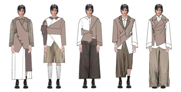 设计作品以自然命题为出发点,探索人与自然、城市的边界。将现代建筑几何和自然生命有机结合,提取、转化为服装语言,并结合实用主义和解构主义将多种应用场景的产品进行有机整理与合理归纳,创造出独特的现代都市美感。