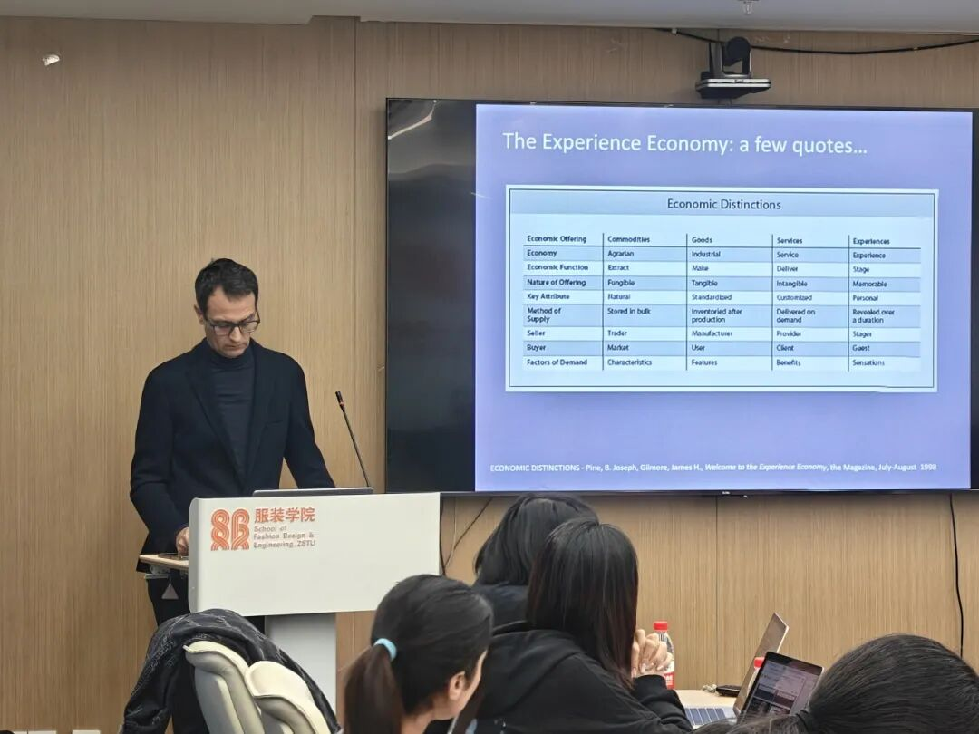 近日,米兰理工大学设计学院教授、中国美术学院及清华大学客座教授Lorenzo Morganti应邀来访我院。Lorenzo Morganti教授长期专注于时尚设计、展陈艺术与品牌营销领域。本次讲座以“体验式购物与店铺设计”为主题,围绕“体验经济”时代背景下零售业的转型与创新展开深入探讨。讲座由服装设计与工程系副教授郑晶晶老师主持,服装设计与工程专业师生代表共同参与。