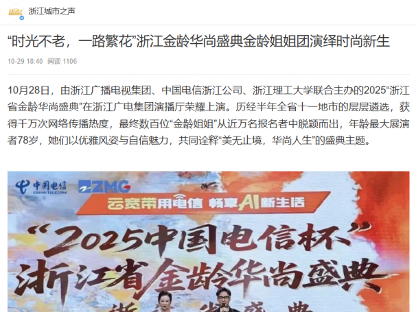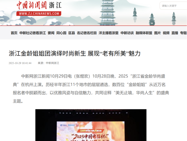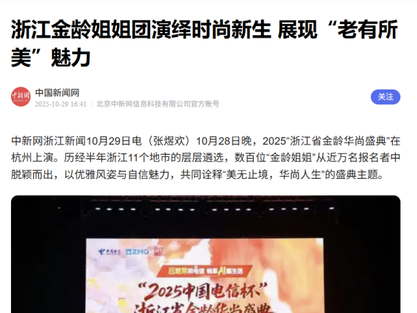 “金龄华尚盛典”是对积极老龄观的生动阐释,此活动得到了社会各界的高度认同与广泛关注。截至目前,本次盛典在全网的图片浏览量达530万。该活动获得了中新社、凤凰网、钱江电视台“新闻+”、中国蓝新闻、浙江城市之声、中国网等主流媒体的广泛报道与转载,社会影响力显著,不仅为银发时尚放大声量,更推动全年龄友好社会建设,促进代际共融。