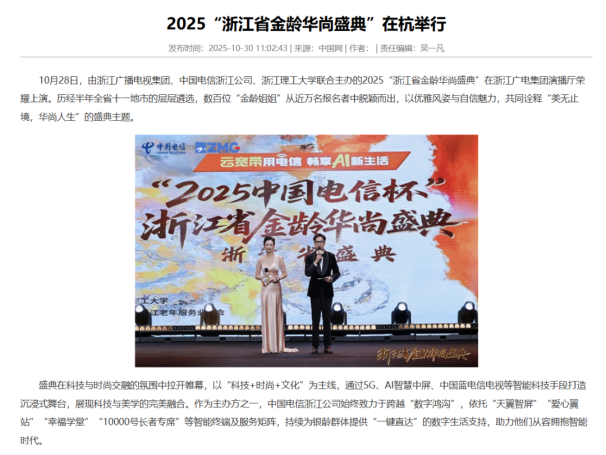 10月28日,由浙江理工大学、浙江广播电视集团、中国电信浙江公司联合主办的2025“浙江省金龄华尚盛典”浙江省总决赛于浙江广电集团演播厅顺利举行。浙江广播电视集团党委委员 、副总编辑裘永刚,中国电信浙江公司副总经理王强,浙江理工大学服装学院党委书记吴跃峰、副院长须秋洁出席活动现场。