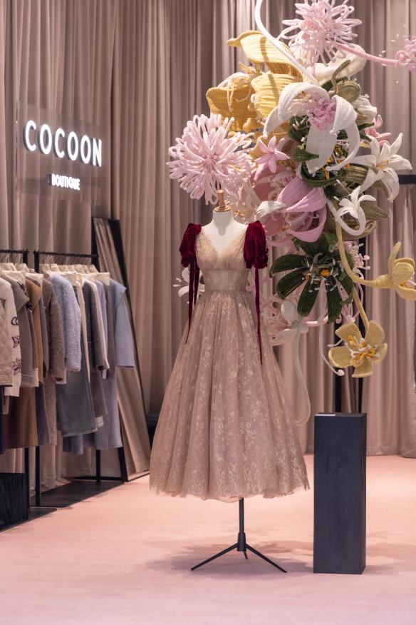 COCOON品牌自2001年创立以来,一直致力于探索与艺术 、时尚等多维度的创新以及品牌文化的延伸,将美好哲学的生活方式融入每一个社交场合,打造兼具法式风格与新东方美学的精致优雅时装。品牌从百老汇名剧《Butterflies are Free》中汲取灵感,以“蜕变后的蝴蝶”为寓意,为女性呈现出浪漫而具有艺术感的时尚作品。此次主题艺术展分布于天目里17号楼B1层主题艺术画廊、L1层主题快闪空间及L3层高定工坊沙龙,通过多元化的空间呈现,全面展示了品牌的艺术理念与设计美学。