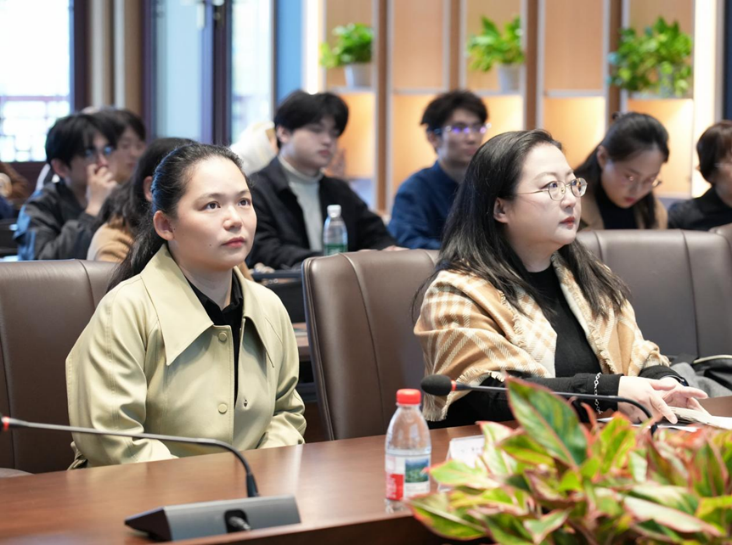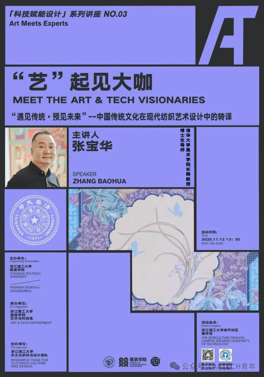 近日,服装学院艺术与科技系“艺”起见大咖系列讲座《“遇见传统·预见未来”——中国传统文化在现代纺织艺术设计中的转译》在浙江理工大学临平校区蚕学馆二楼举行。讲座特邀清华大学美术学院长聘教授、博士生导师张宝华担任主讲嘉宾,分享传统文化在纺织设计中的创新表达路径。讲座由服装学院副院长顾冰菲主持,艺术与科技系主任陈敬玉、副主任胡扬,艺术与科技系、数智时尚设计微专业师生共同参与。