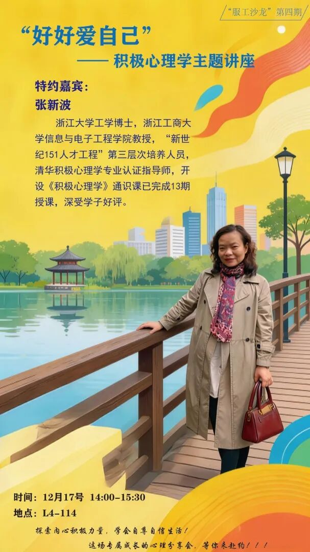 近日,我院服装设计与工程专业第四期服工沙龙在L4-114教室举行。本次活动特别邀请浙江工商大学信息与电子工程学院教授、清华积极心理学专业认证指导师张新波担任嘉宾,以“好好爱自己”为主题进行分享。服工系教师代表闫彦红、夏馨、专业本研学生代表参加本次沙龙。
