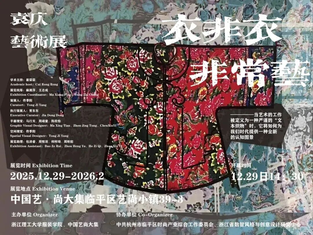 近日,浙江理工大学服装学院联合中国艺尚大集、中共杭州市临平区时尚产业综合工作委员会和浙江省数智风格与创意设计研究中心等单位,在中国艺尚大集举办《衣非衣 非常艺》袁仄艺术展揭幕活动。临平区委常委、宣传部部长沈威,浙江理工大学服装学院党委书记吴跃峰、院长崔荣荣,中国美术学院教授吴海燕,中央广播电视总台中视实业集团有限公司产教融合项目发起人沈伟立、刘明习,北京多木传媒董事长苏烽、总裁蒋冬媛、总经理费叶红,艺尚小镇运营公司副总经理郑健,落地俱乐部创始人陈海平先生、知名摄影家田晓教授等出席开幕仪式。本次活动由崔荣荣教授主持。相关单位领导、行业同仁,师生及嘉宾共百余人参加本次开幕仪式。