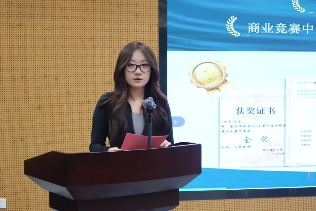 获奖学生代表王芷恬向现场作成长报告,回顾了在学校与企业的支持下,她用竞赛磨砺专业、让设计落地市场的逐梦之路。未来,她将继续以设计为笔、以市场为题,在户外服装领域书写中国青年的专业答卷。